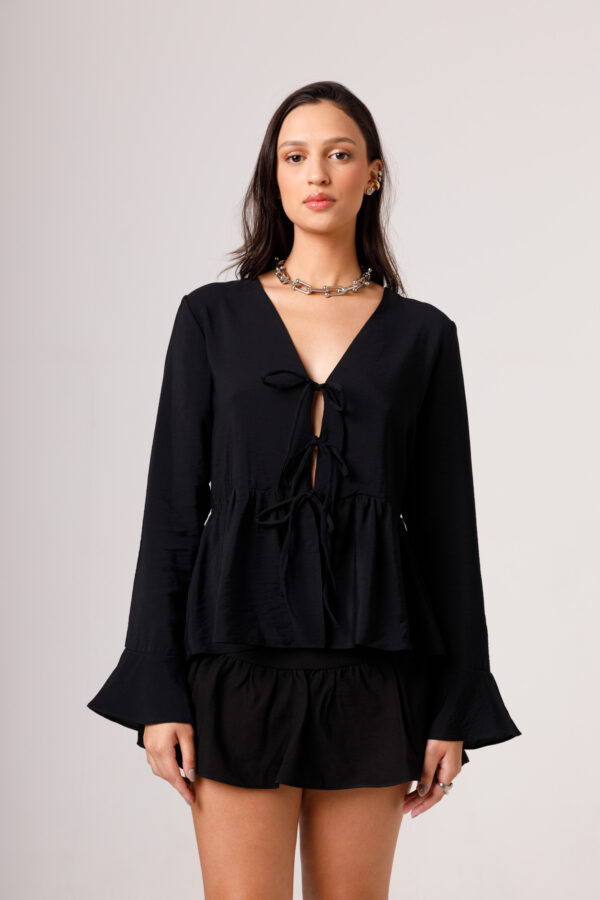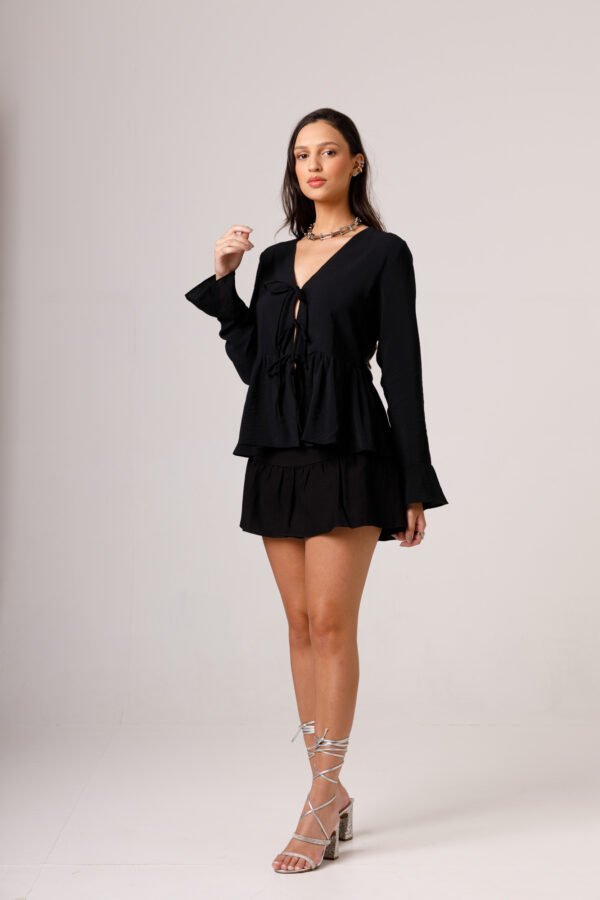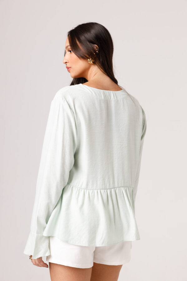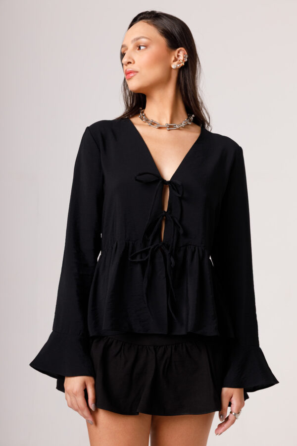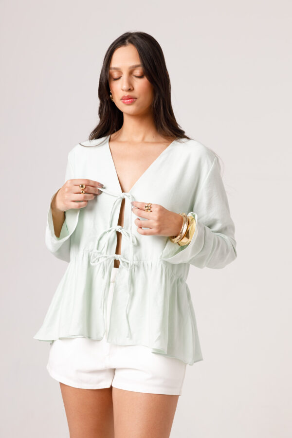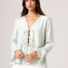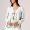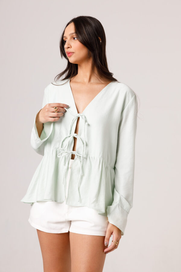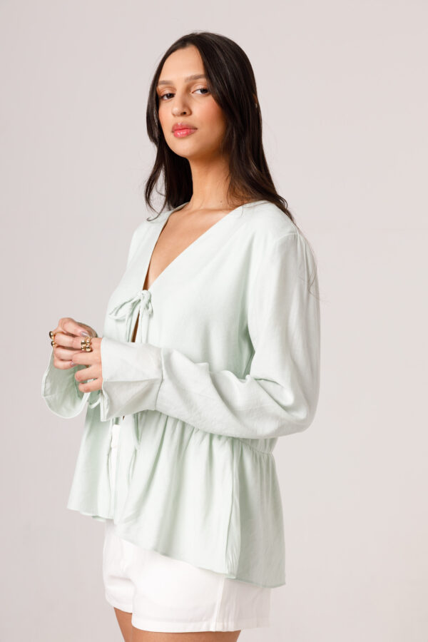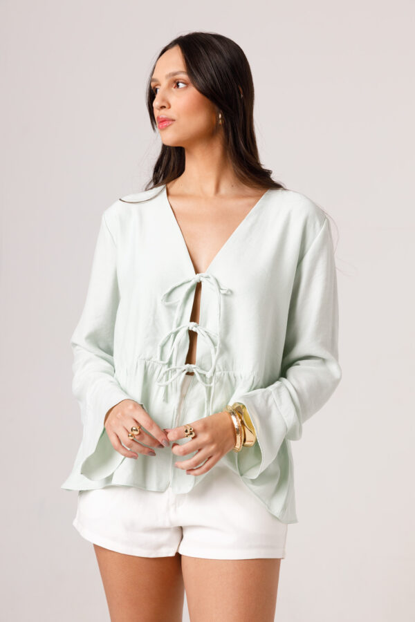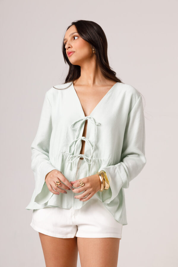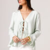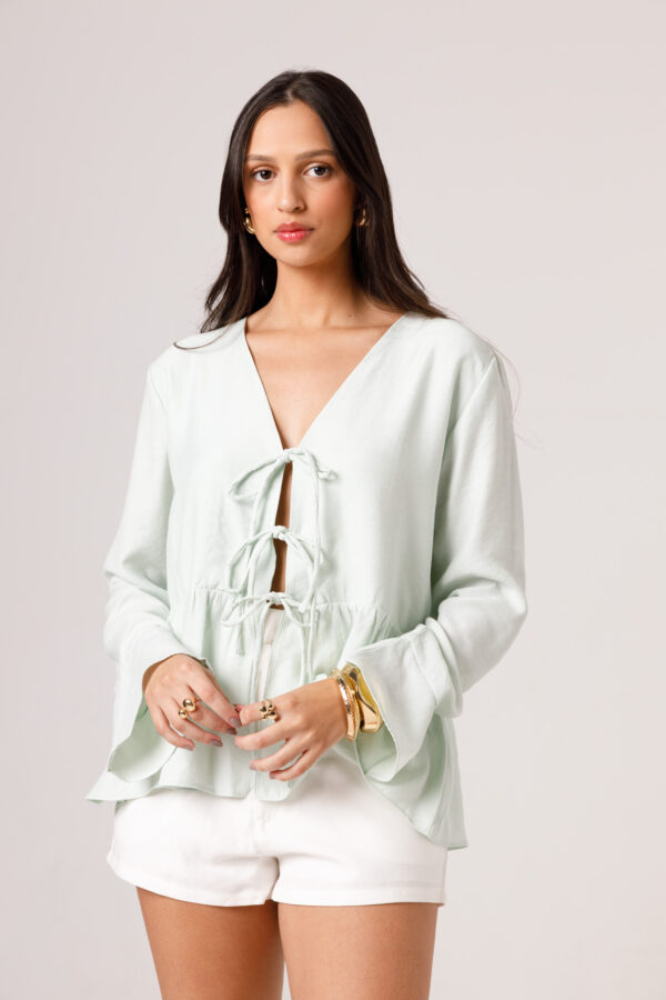 A BLUSA AURA BRANCA reúne feminilidade e presença visual, com mangas longas, decote em V e amarração frontal que valoriza o busto. A barra com babado traz movimento e contribui para o charme da peça. É uma blusa ideal para composições mais delicadas e estilosas, combinando bem com shorts, saias ou calças. Disponível nas cores Branca, Verde e Preta.