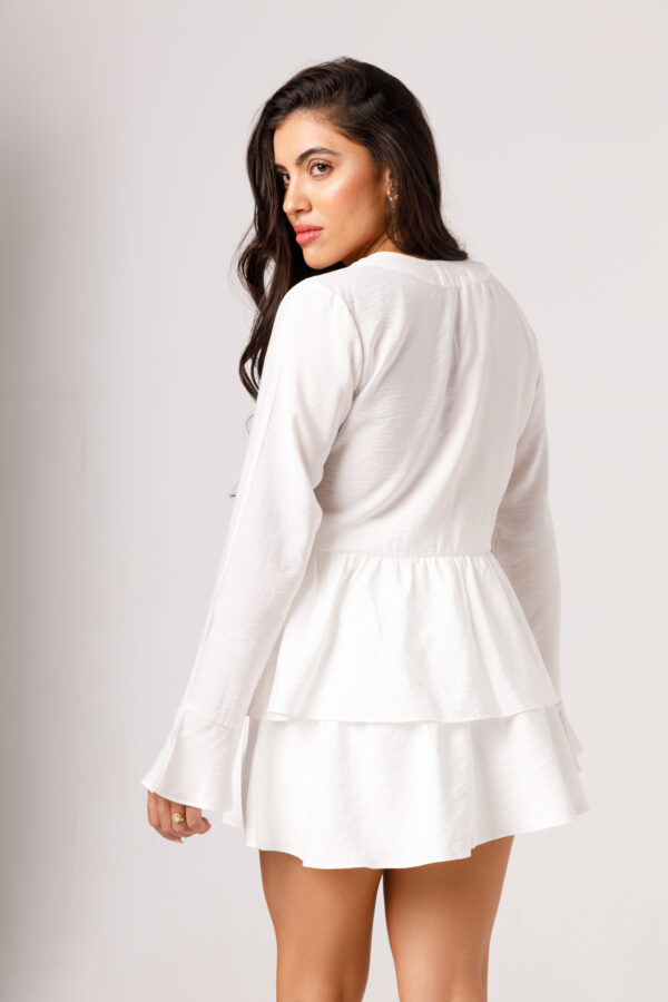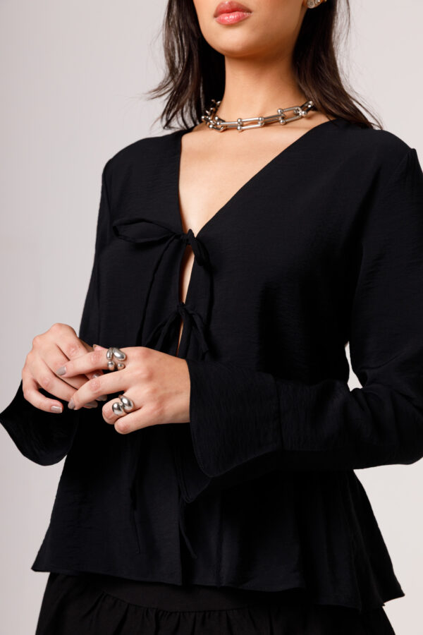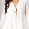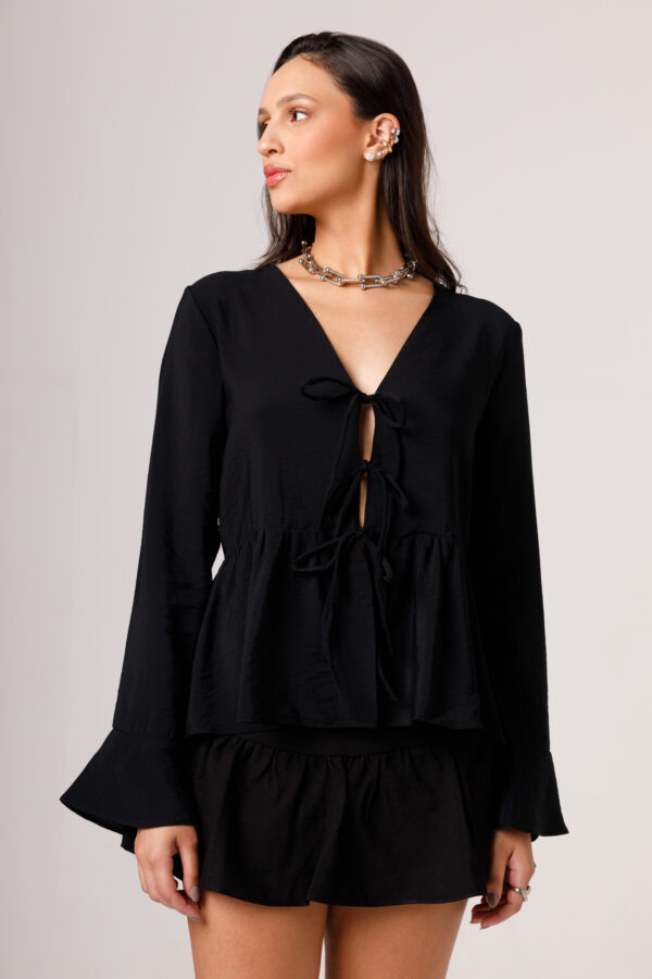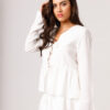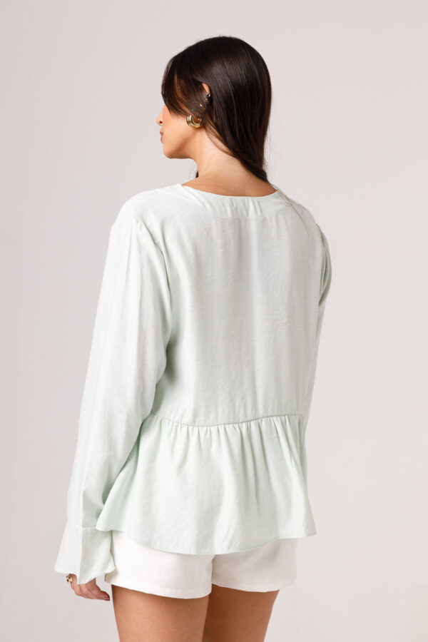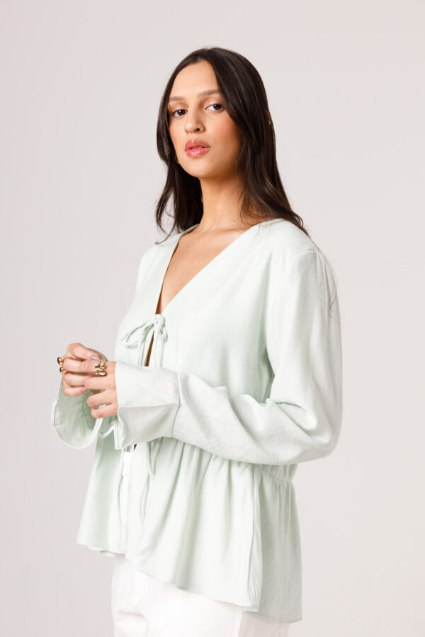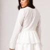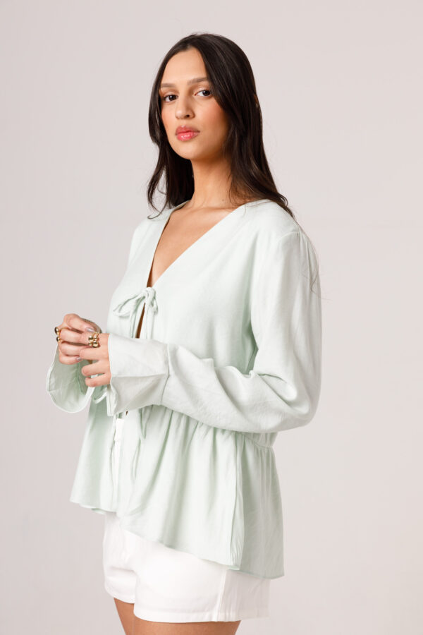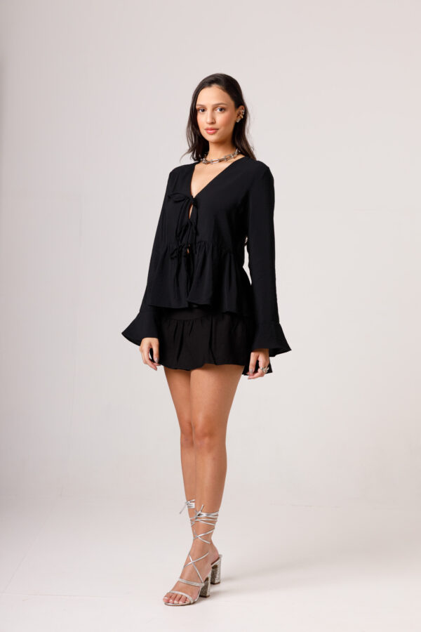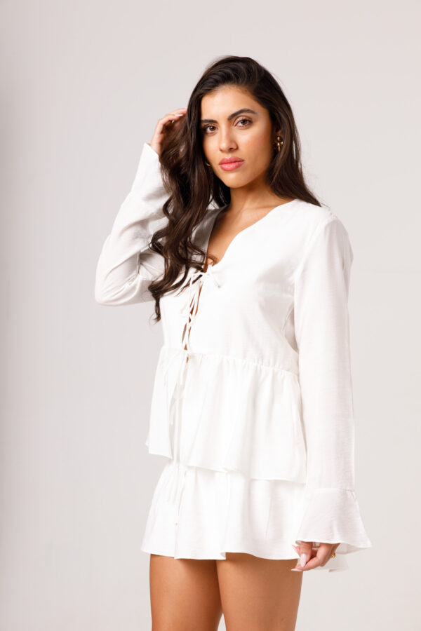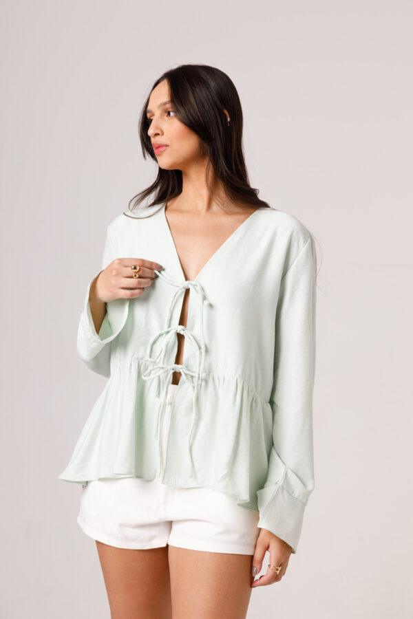 A BLUSA AURA BRANCA reúne feminilidade e presença visual, com mangas longas, decote em V e amarração frontal que valoriza o busto. A barra com babado traz movimento e contribui para o charme da peça. É uma blusa ideal para composições mais delicadas e estilosas, combinando bem com shorts, saias ou calças. Disponível nas cores Branca, Verde e Preta.