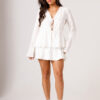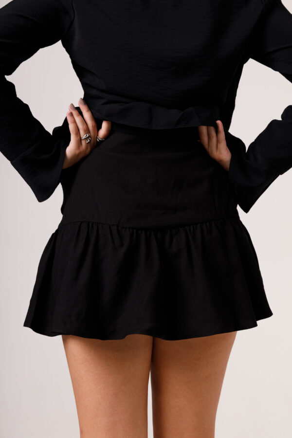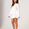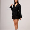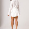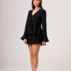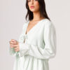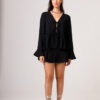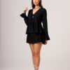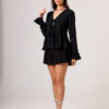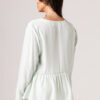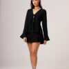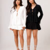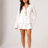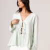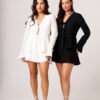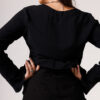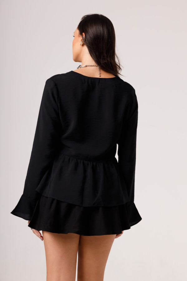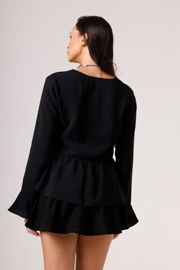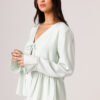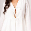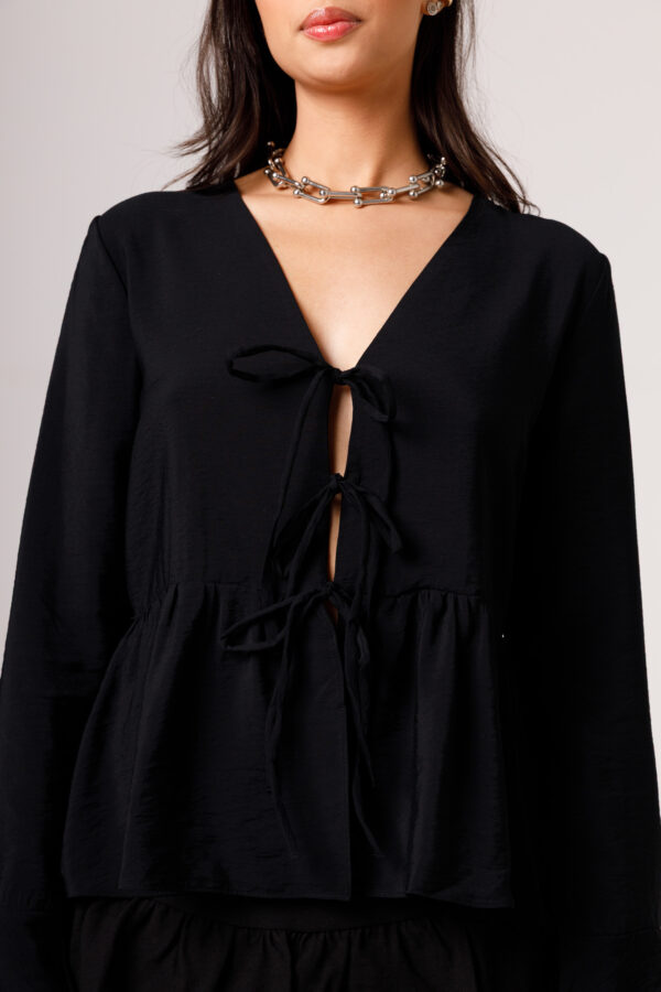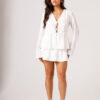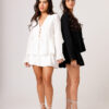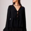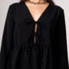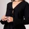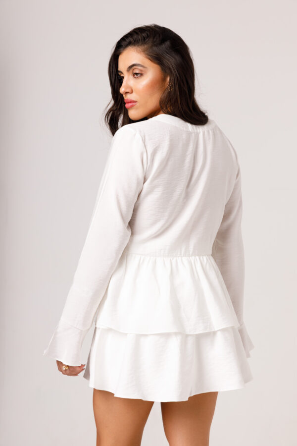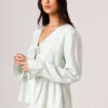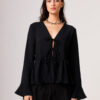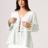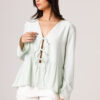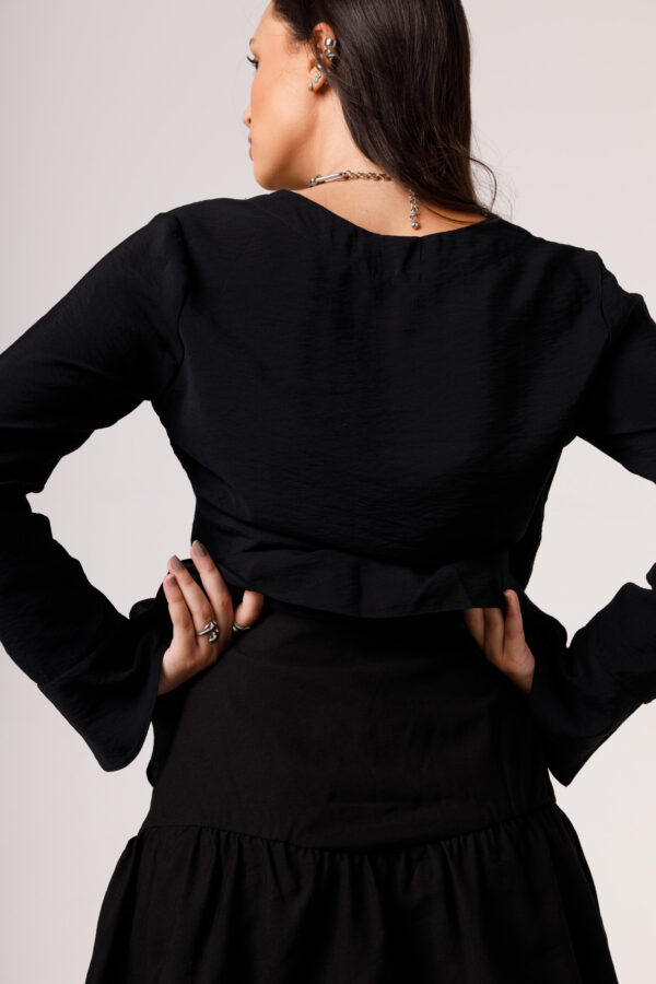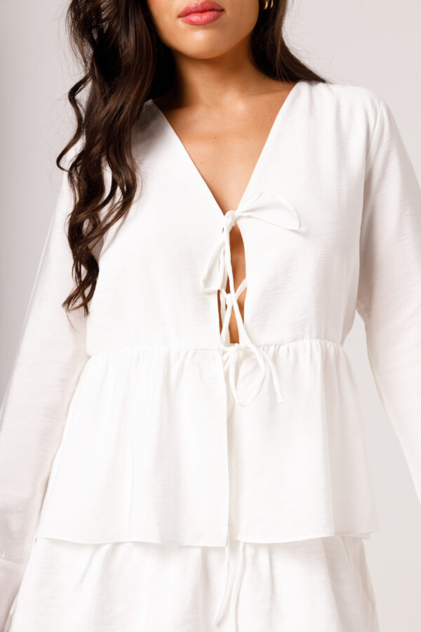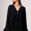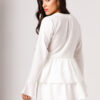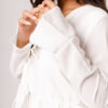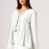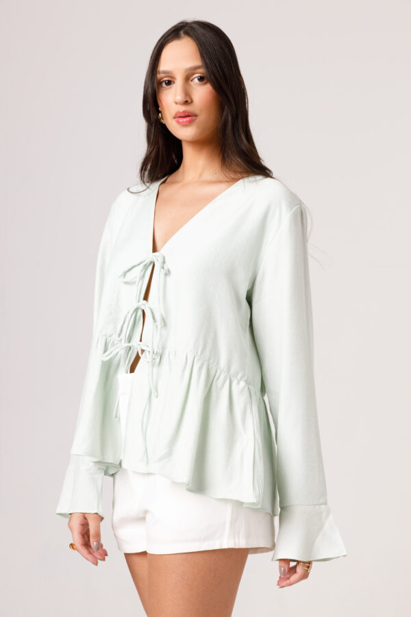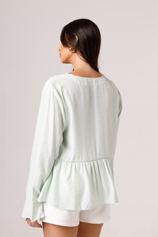 A BLUSA AURA BRANCA reúne feminilidade e presença visual, com mangas longas, decote em V e amarração frontal que valoriza o busto. A barra com babado traz movimento e contribui para o charme da peça. É uma blusa ideal para composições mais delicadas e estilosas, combinando bem com shorts, saias ou calças. Disponível nas cores Branca, Verde e Preta.